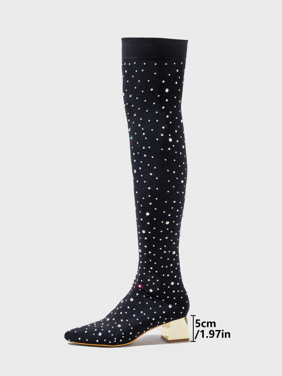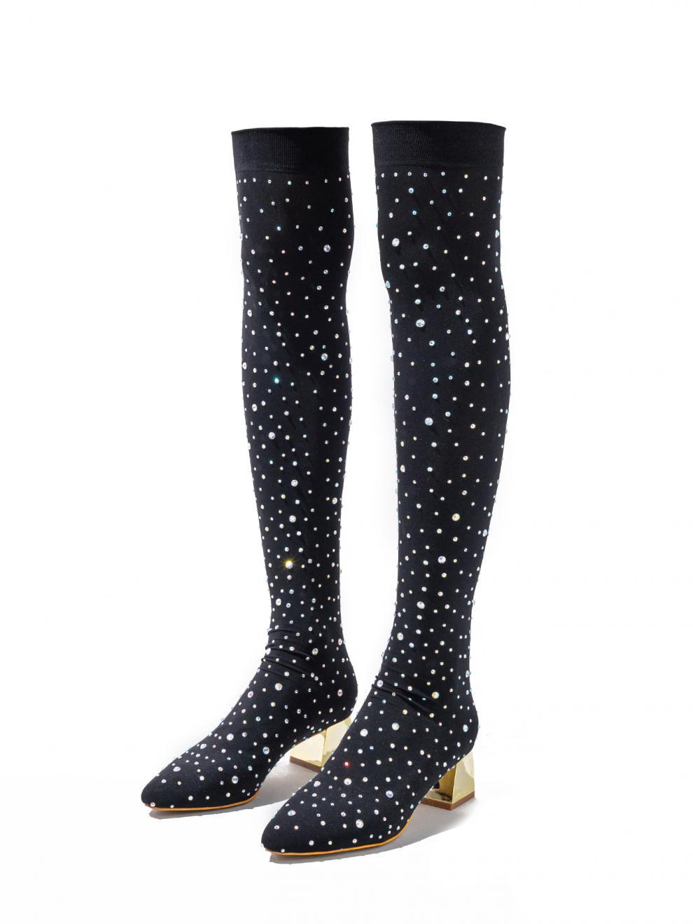 Sexy Black All Match Stretch Stovepipe Rhinestone Chunky Heel Nightclub Pointed Boots