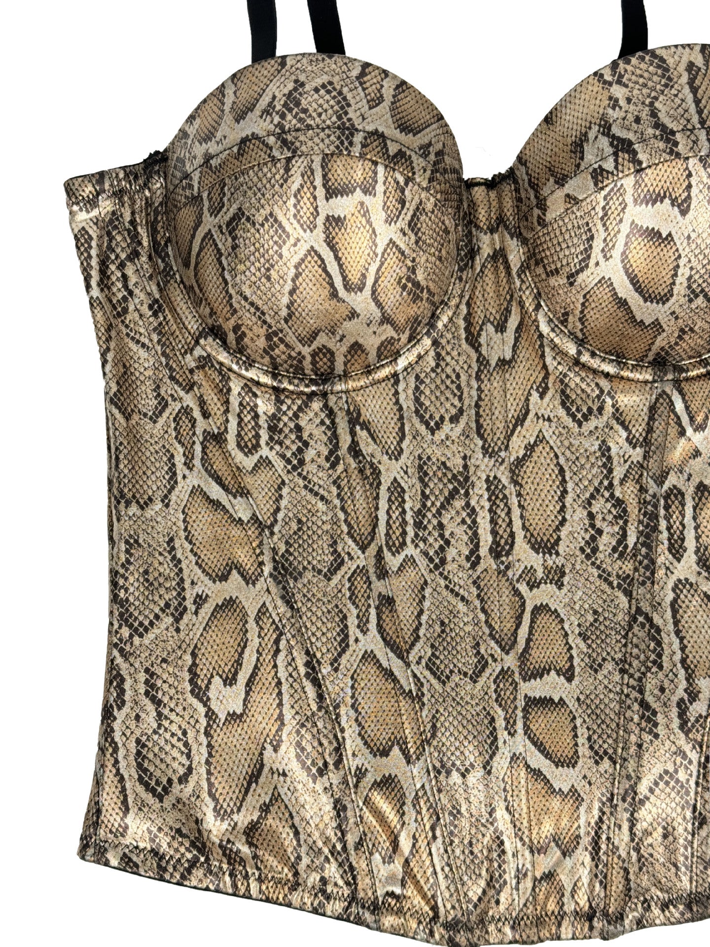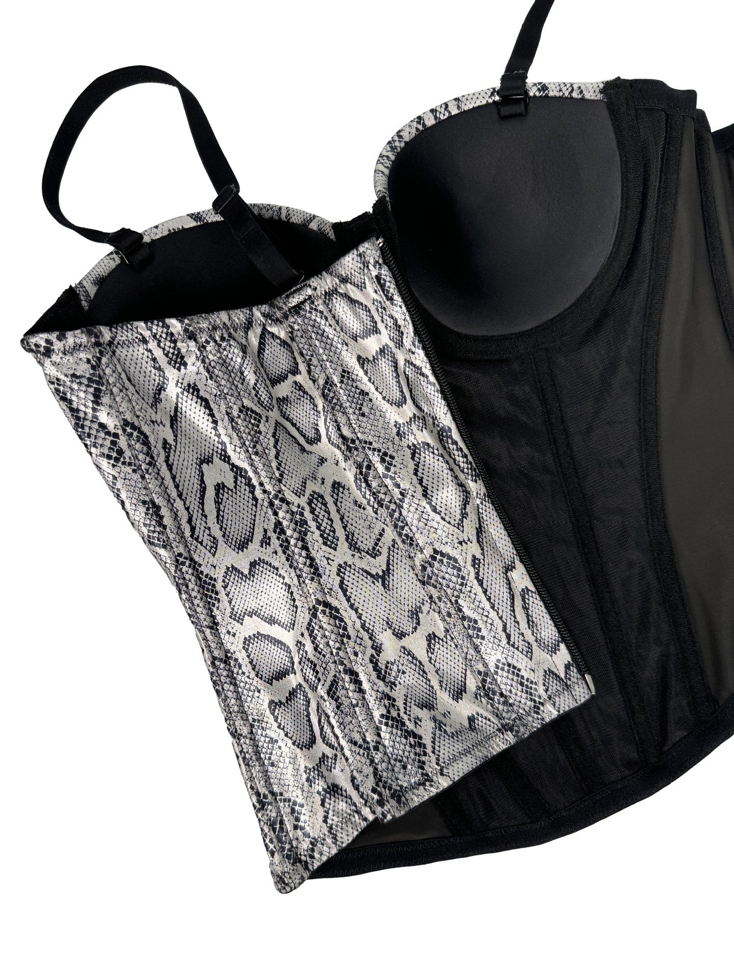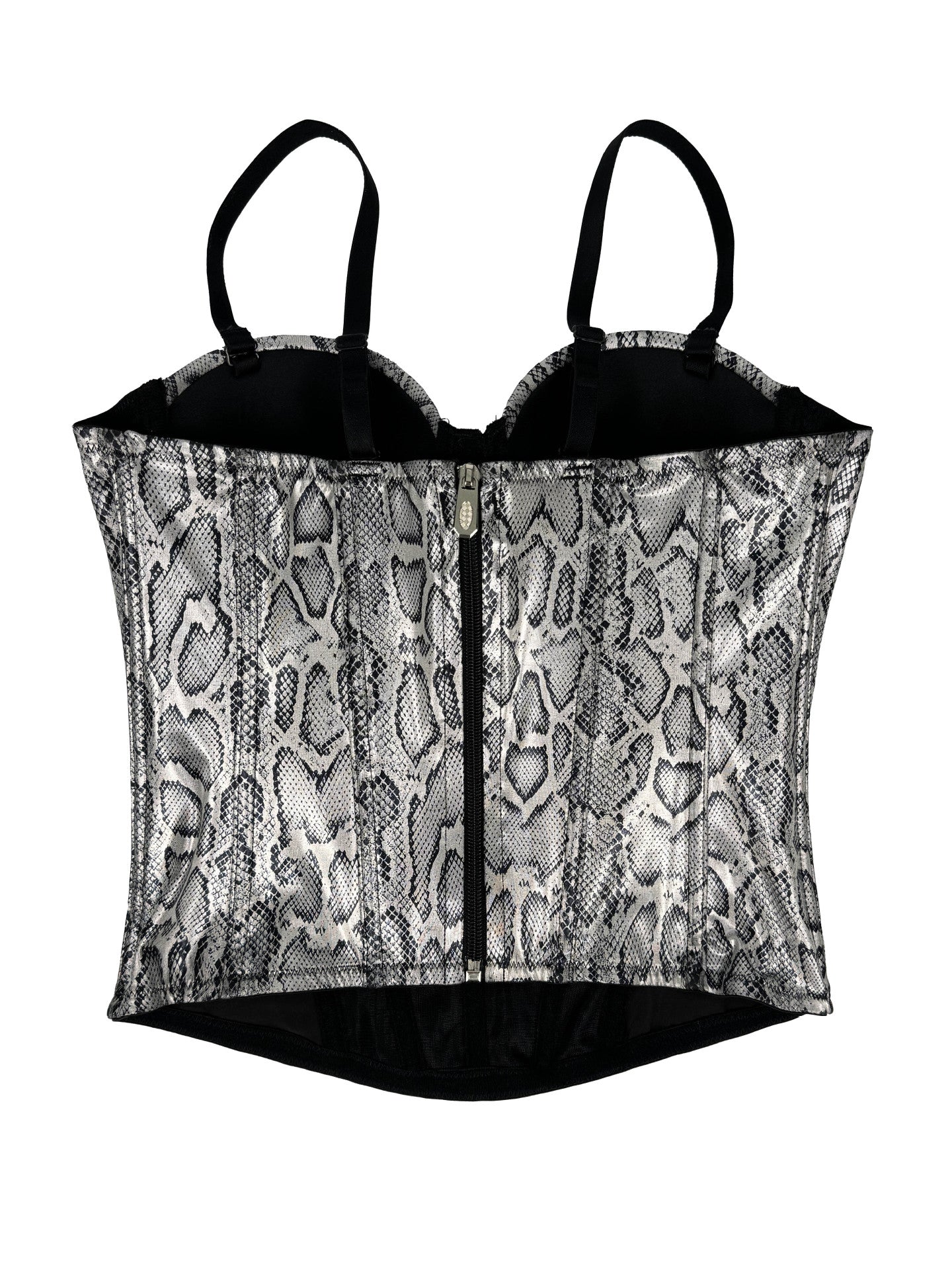 This fierce snake print corset brings instant edge to any look. Structured boning sculpts and cinches your silhouette while the plunging V-neckline adds sultry drama. The bold animal print does the talking — all you have to do is show up.