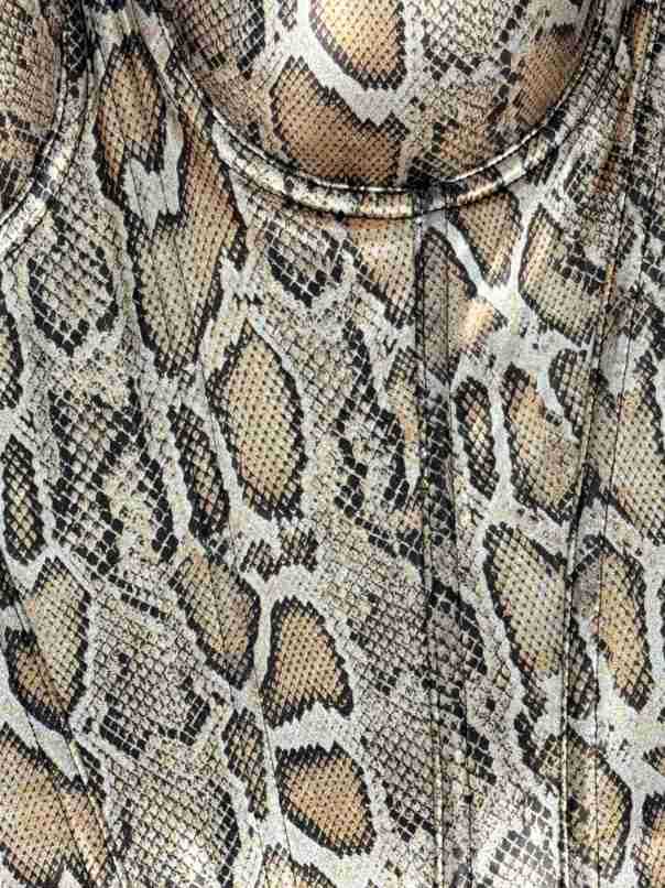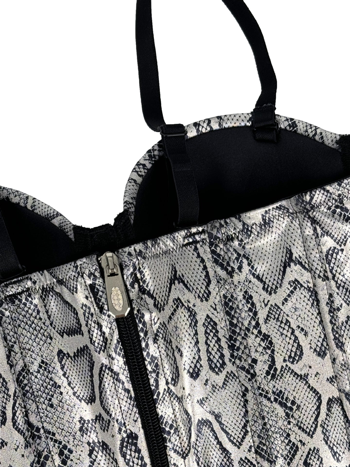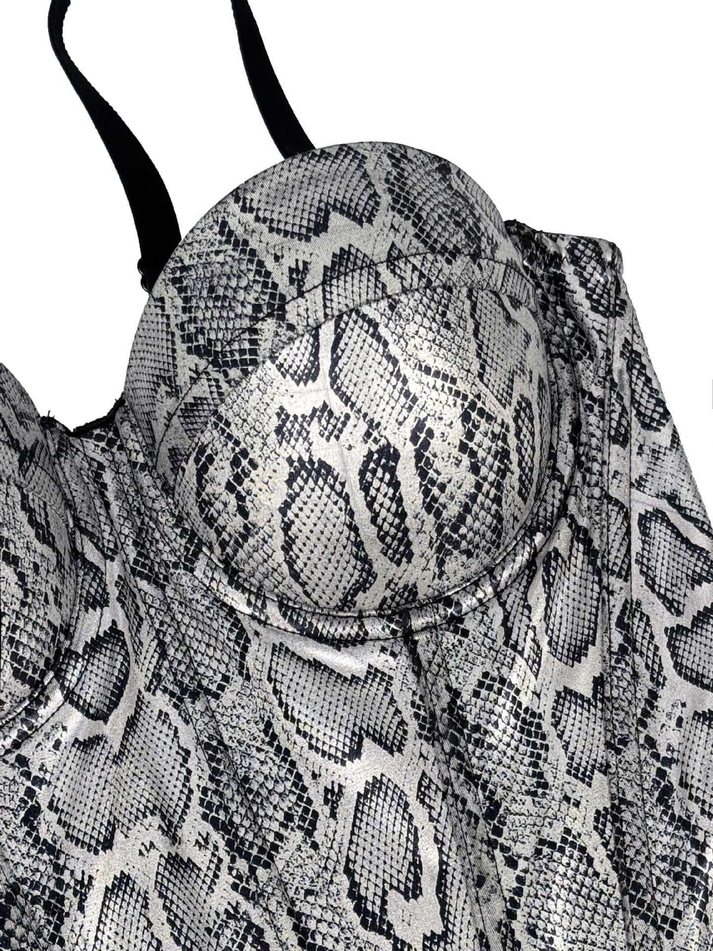 This fierce snake print corset brings instant edge to any look. Structured boning sculpts and cinches your silhouette while the plunging V-neckline adds sultry drama. The bold animal print does the talking — all you have to do is show up.