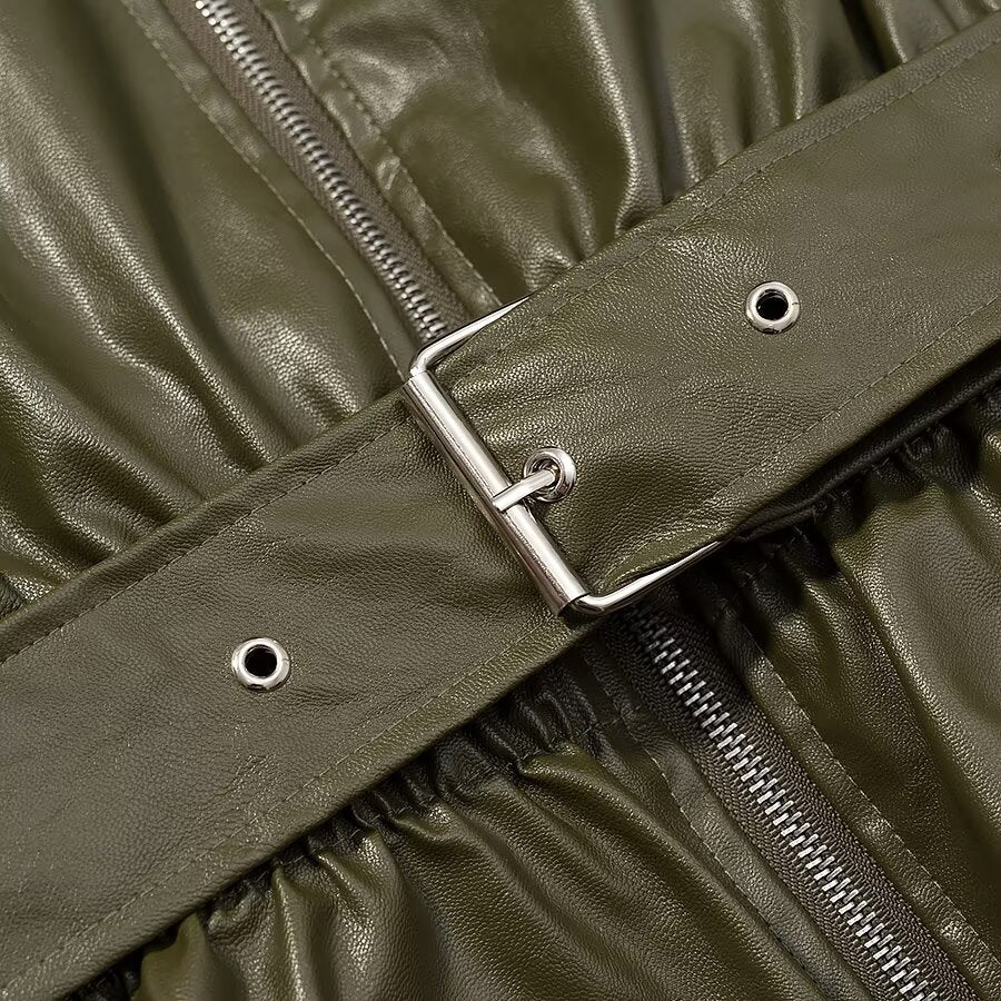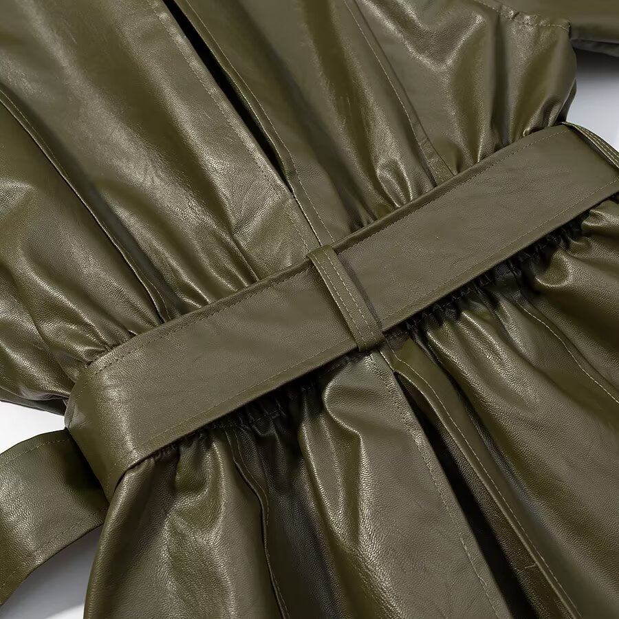 An elegant long faux-leather coat in a rich green tone, designed with a relaxed fit and elastic waist belt for effortless shape. Finished with sleek zipper details and functional pockets, it’s a standout layer for spring and fall styling.